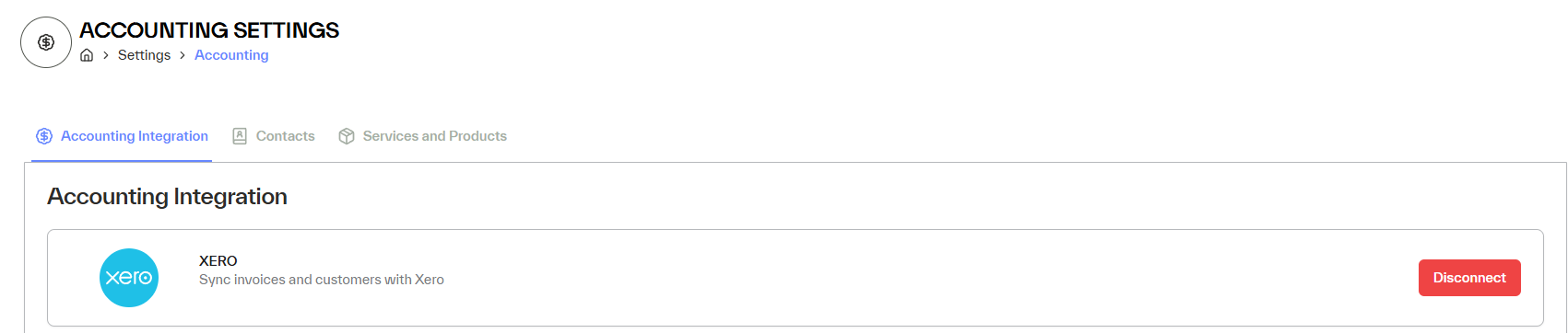 Accounting SettingsSet up link to Xero, sync contacts and services and productsAccounting Settings allows Epona to beIntegrate with XeroSync ContactsSync Services and Products