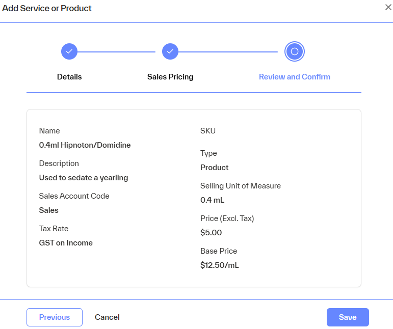 Review the details entered for the Product. If errors are found select Previous and make changes. If the information is correct, select Save to add the new Product.