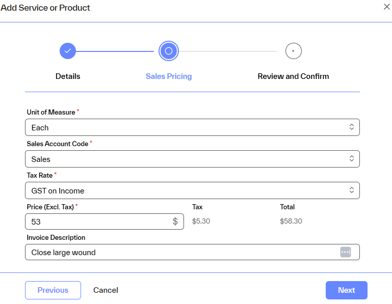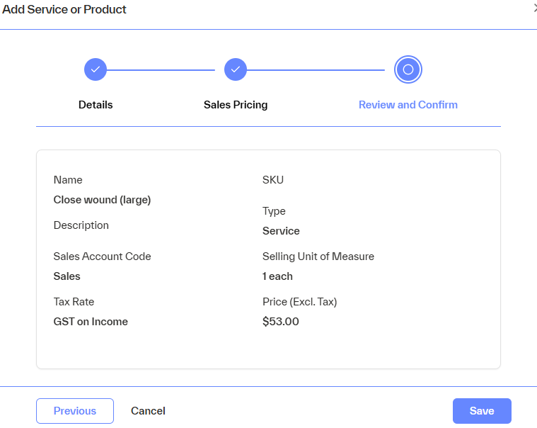 Review the details entered for the Procedure. If errors are found select Previous and make changes. If the information is correct, select Save to add the new Procedure.
