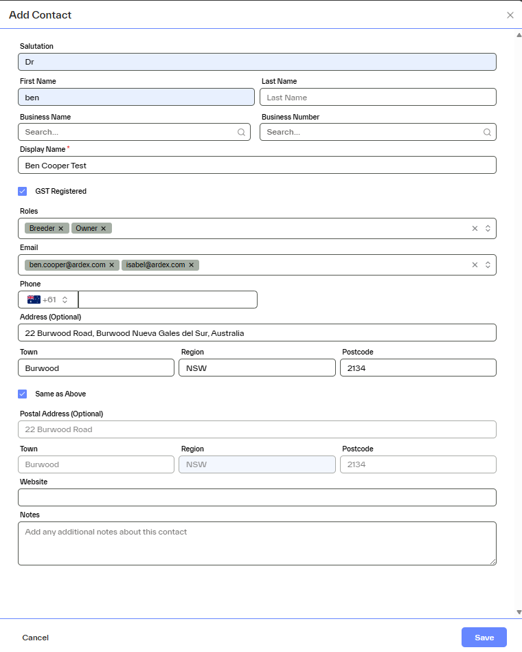 The display name will be auto populated with First Name and Last Name or Business Name if both of them blank. This can be change if required. The display name will appear in the contact list and drop-down lists.