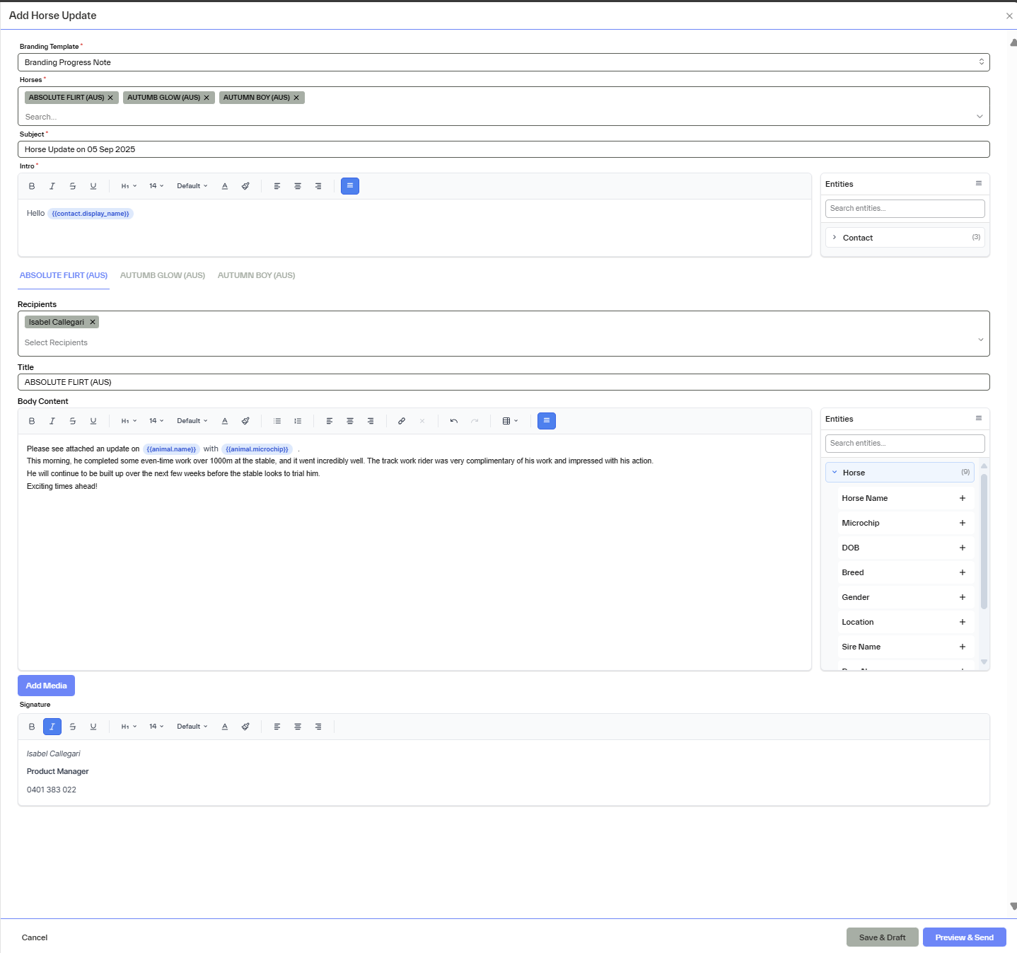 Save as Draft: Creates one draft per unique horse + recipient combination. This makes it easy to review and selectively send later.