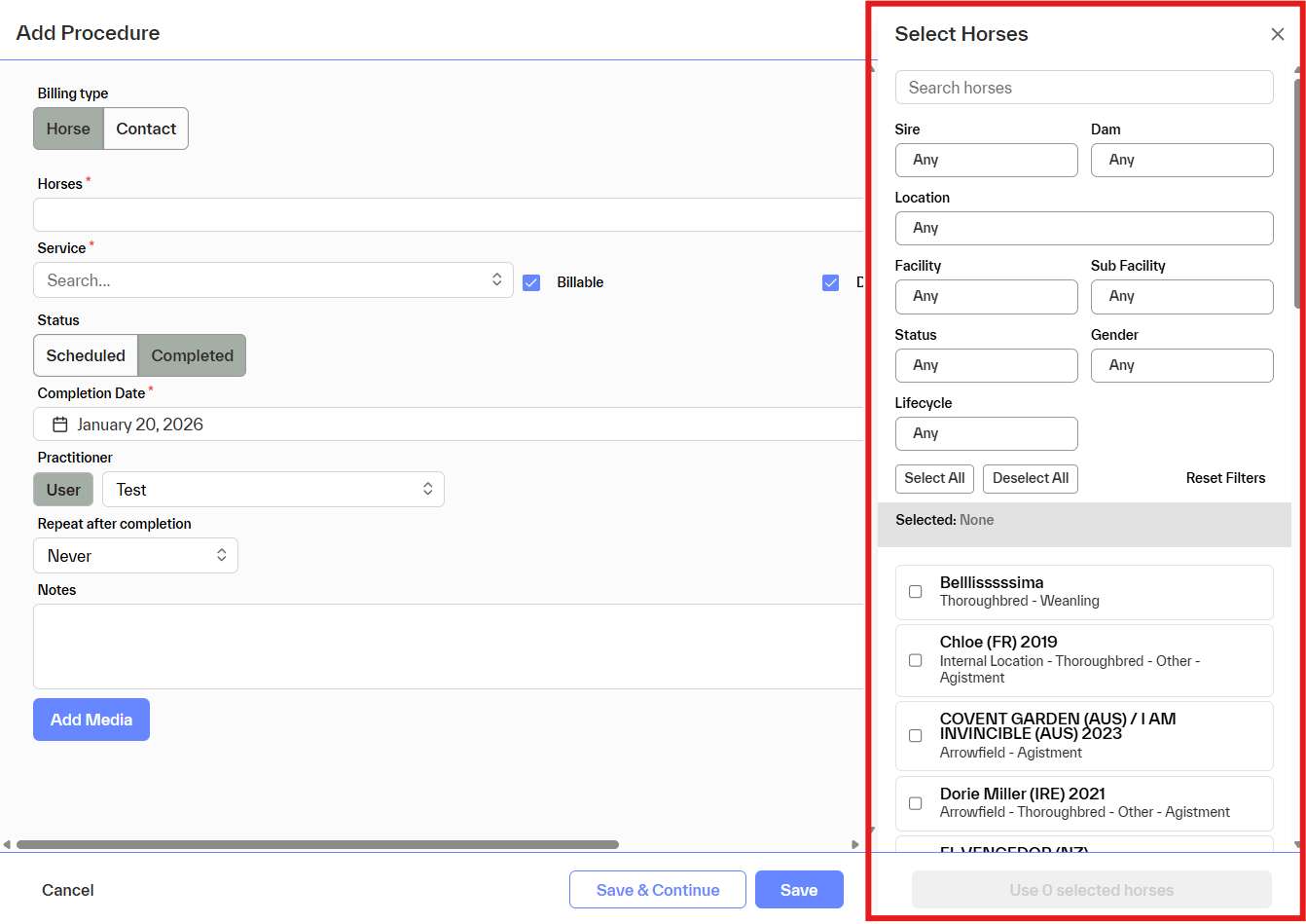 When adding a procedure/transaction/horse update/ movement for multiple horses, you can refine your selection using the Filter button located on the top right above the Horses field. This opens a slide-over panel where you can apply advanced filtering options.
