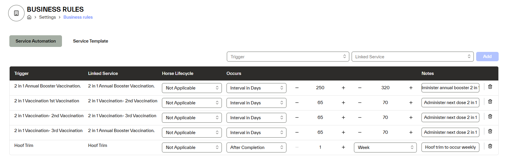 Business rules are used to link procedures or to set automated reminders, e.g., a vaccination program. All Procedures will need to be added via Settings/Service and Products. Once this is done, the business rules can be set under Settings > Business Rules.