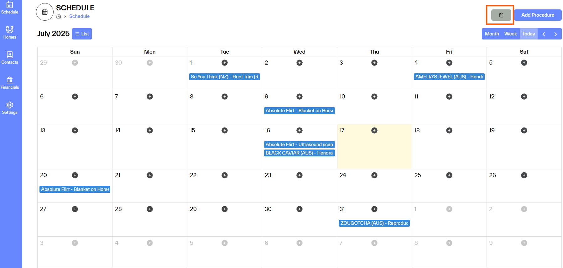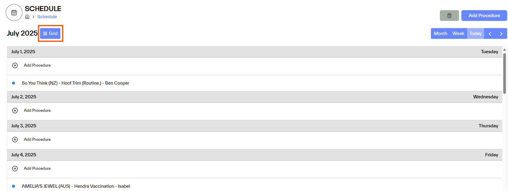 Options to change to one week or move through the months is available below Add procedures