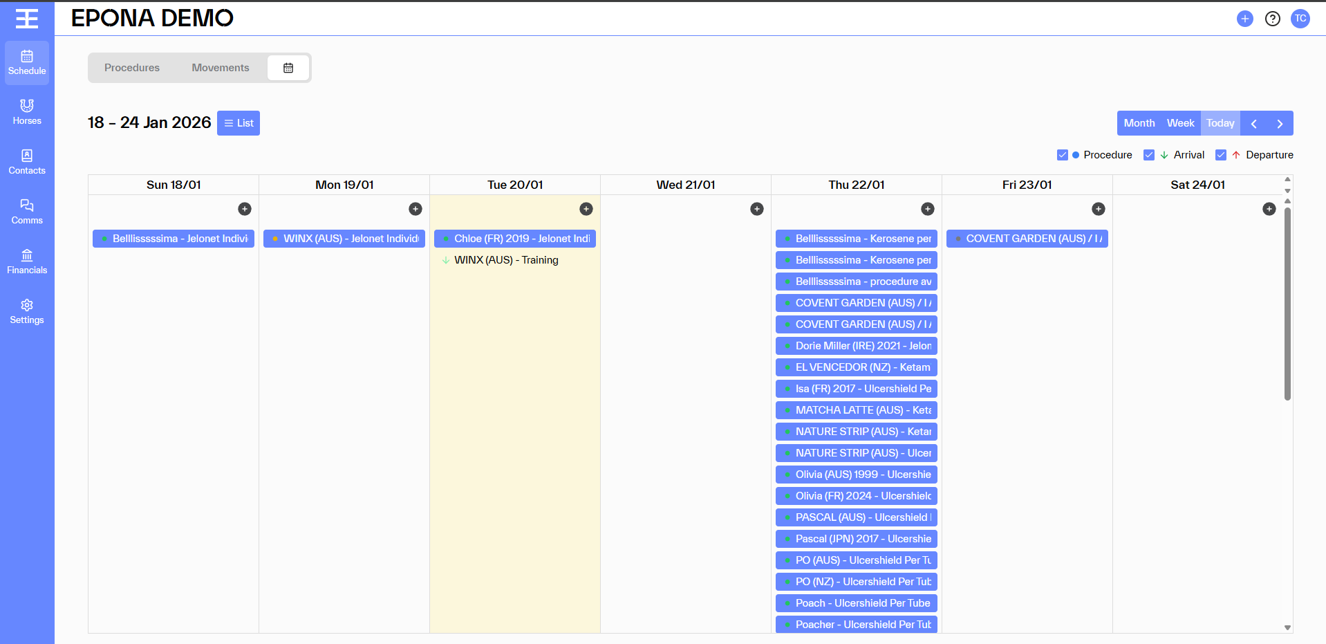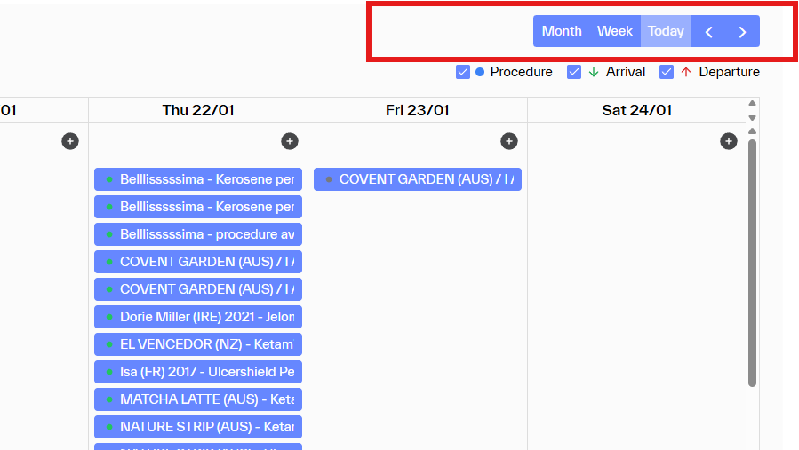 Calendar will show Procedures, Arrival [green down side arrow] and Departure [red up side arrow] depending on which module you have turned on.