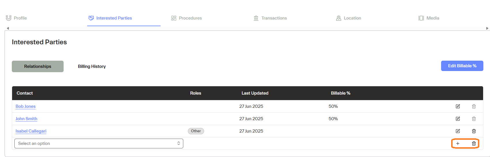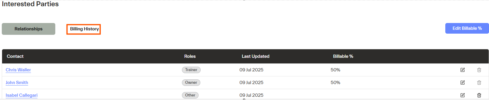 - The edit Billable % option allows the percentage share between the existing owners to be changed or a share to be added to a new billable contact.