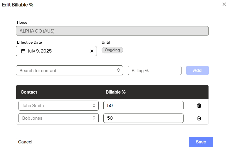 - If the contact will be billed for horse expenses, the billable interested party needs to be added with a share percentage. This is done by selecting Edit Billable %. A horse must be owned 100% at all times. If not all shares have been sold, then a holding account set up as a contact will need to be added to the system so shares can be sold and transactions reallocated from this contact to the actual billable owners.