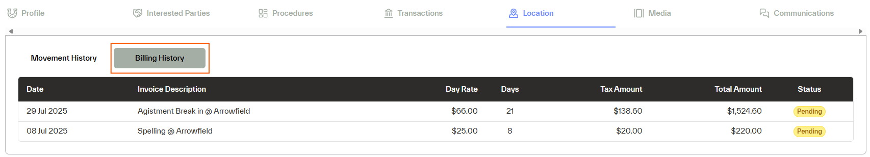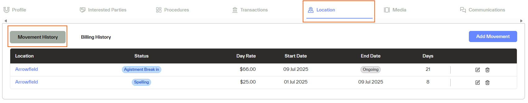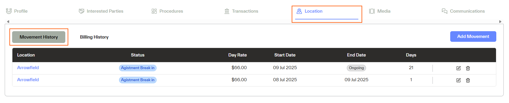 Shows the different location and agistment statuses for a horse. Each time a new movement is added to a horse, the movement will be shown the view.