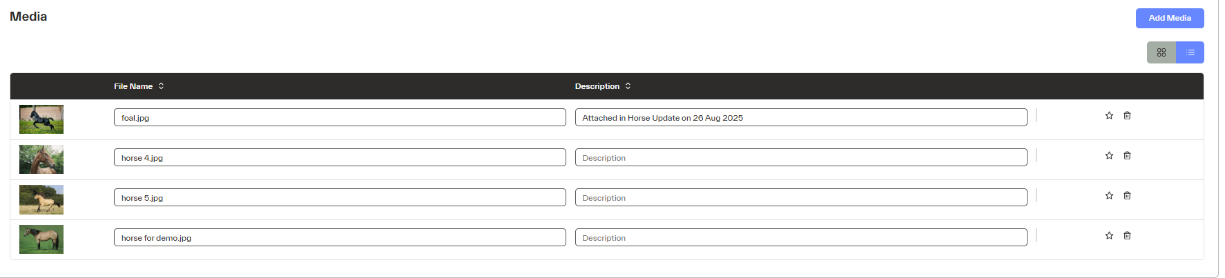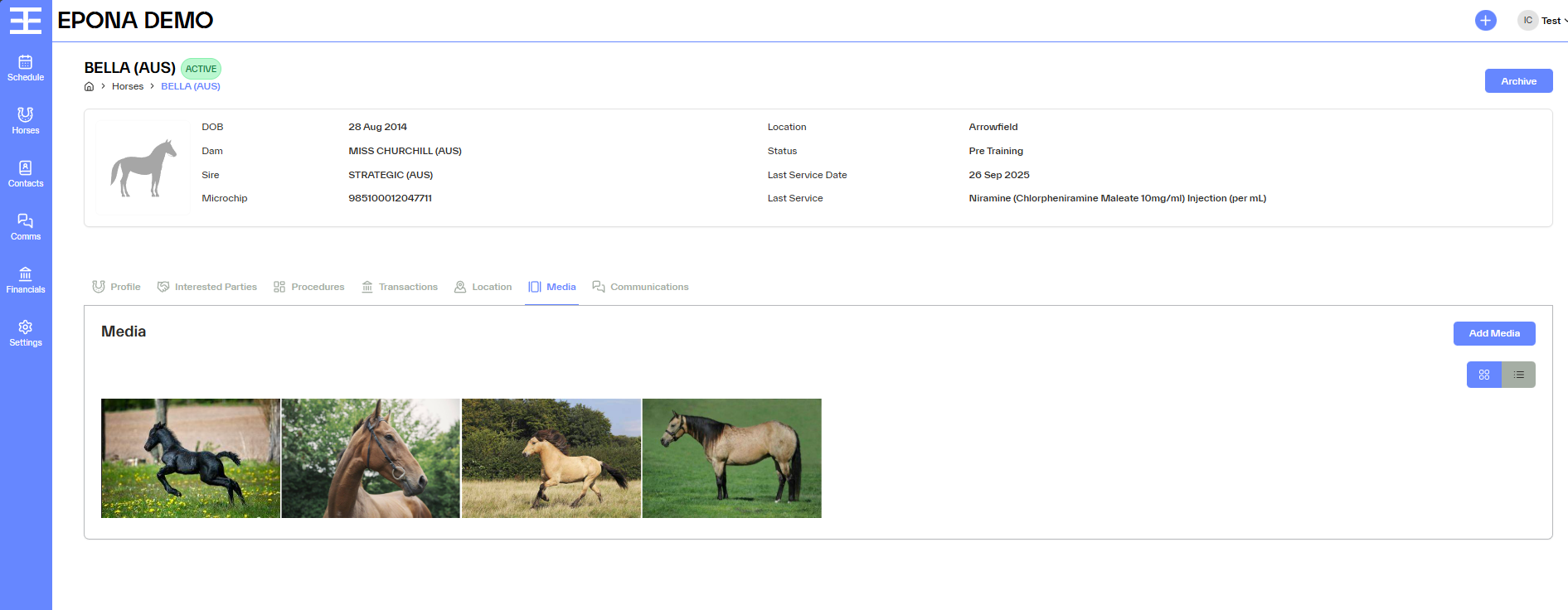 The media tab will display the images uploaded from procedures, communications for that horse and allows new images to be uploaded. The default view are the images added to the horse profile
