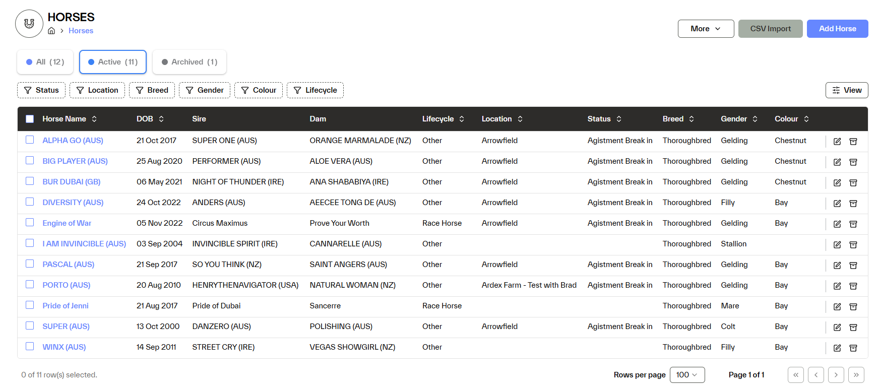 Filter the view via the options at the top of list. More than one filter can be used e.g. show all race horses at my property