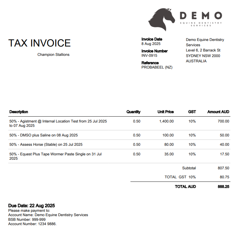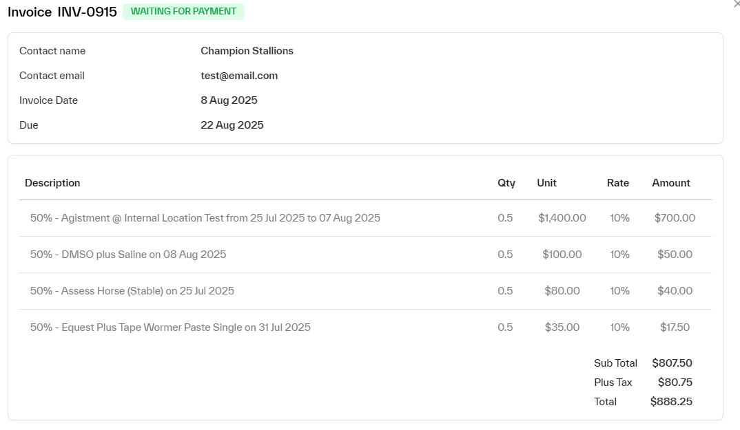 From this page, the invoice can be viewed as a PDF or emailed to the billable contact.