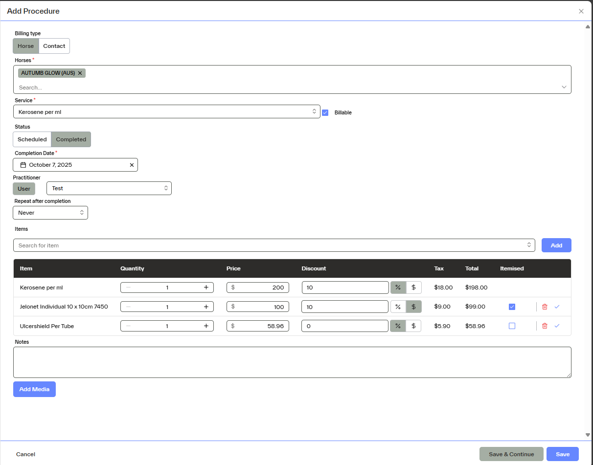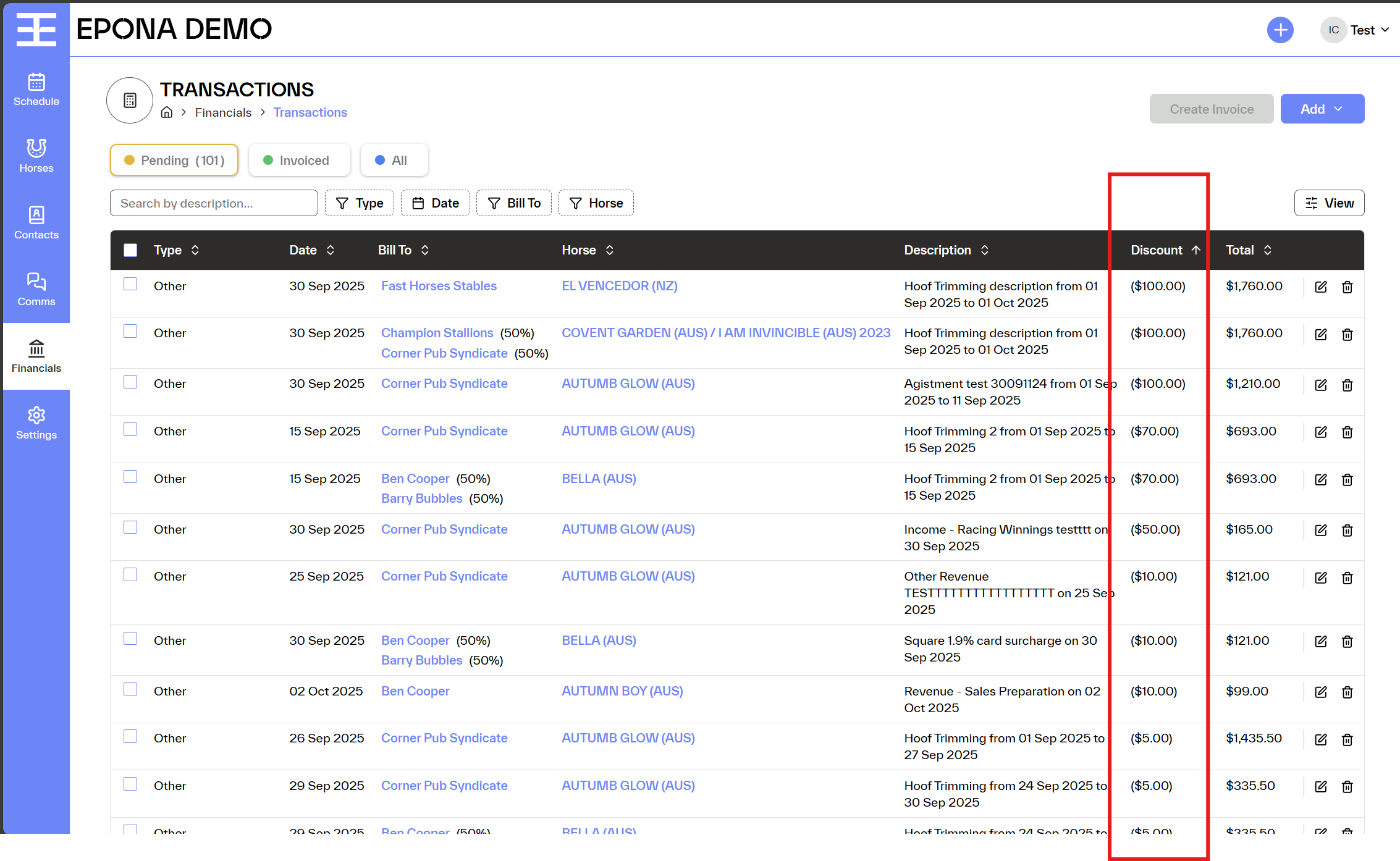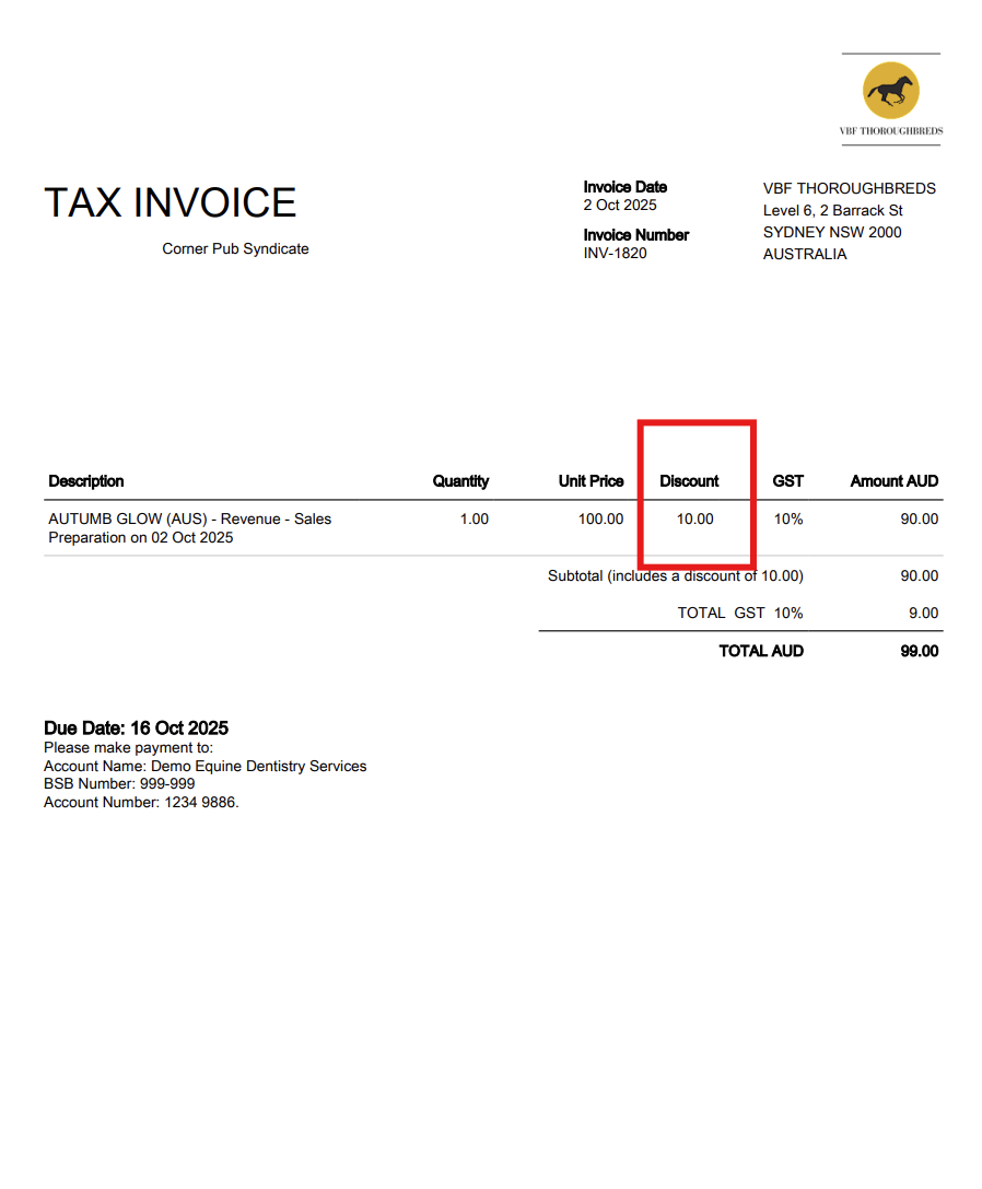 When the procedure is added to a transaction and selected for invoicing, the discount will display in the “Discount” column of the invoice, giving clear visibility of any reductions applied.