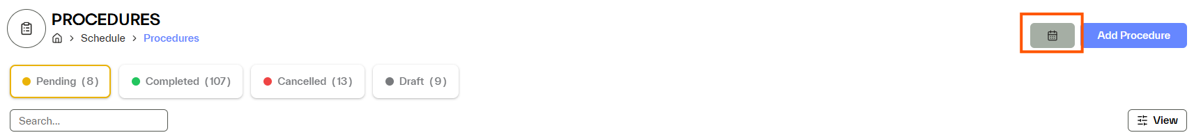 The view can be switched between the Calendar view and Procedure view by selecting the icon next to Add procedure