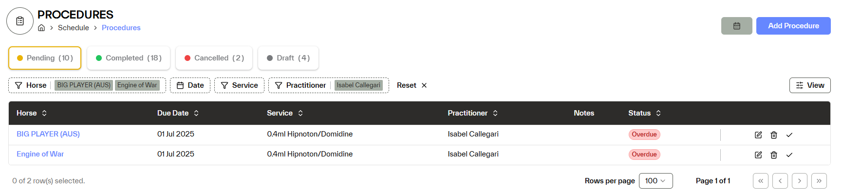 When Schedule/Procedure is selected a list of Pending procedures will be displayed. A procedure can be added to horse(s) and viewed using the procedure status.
