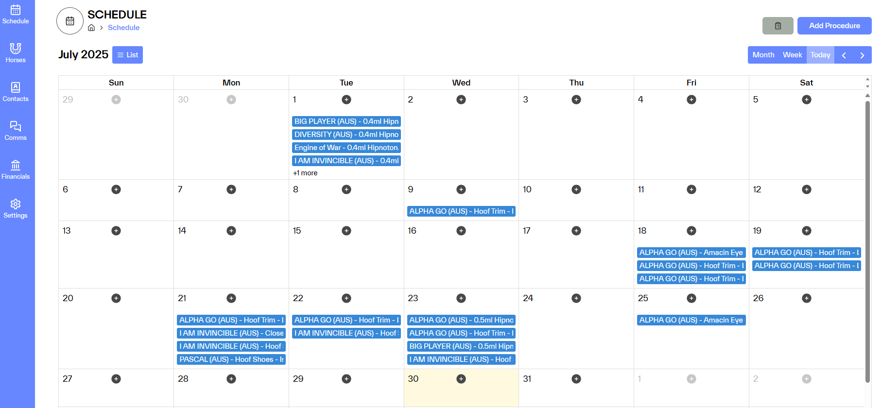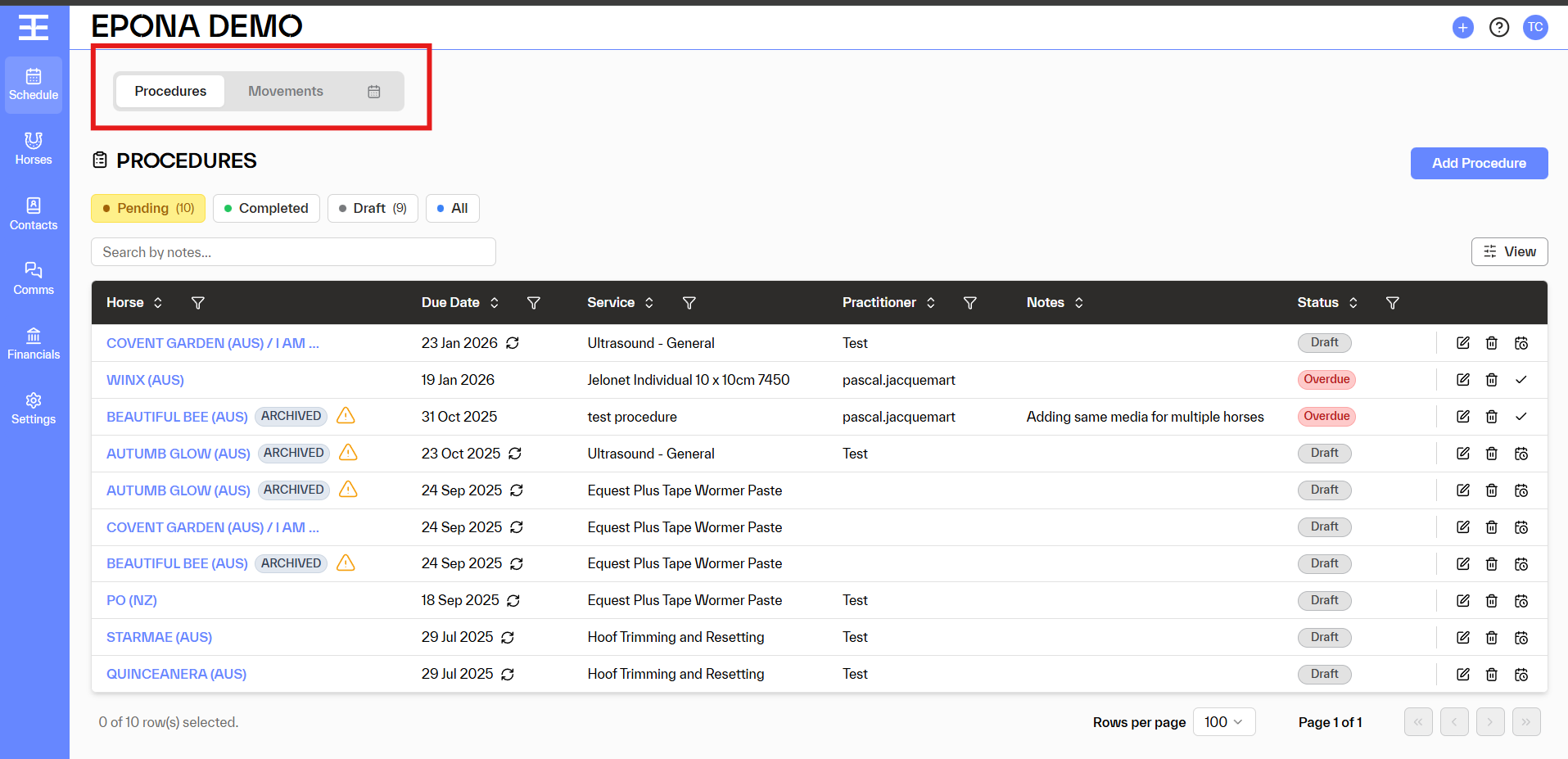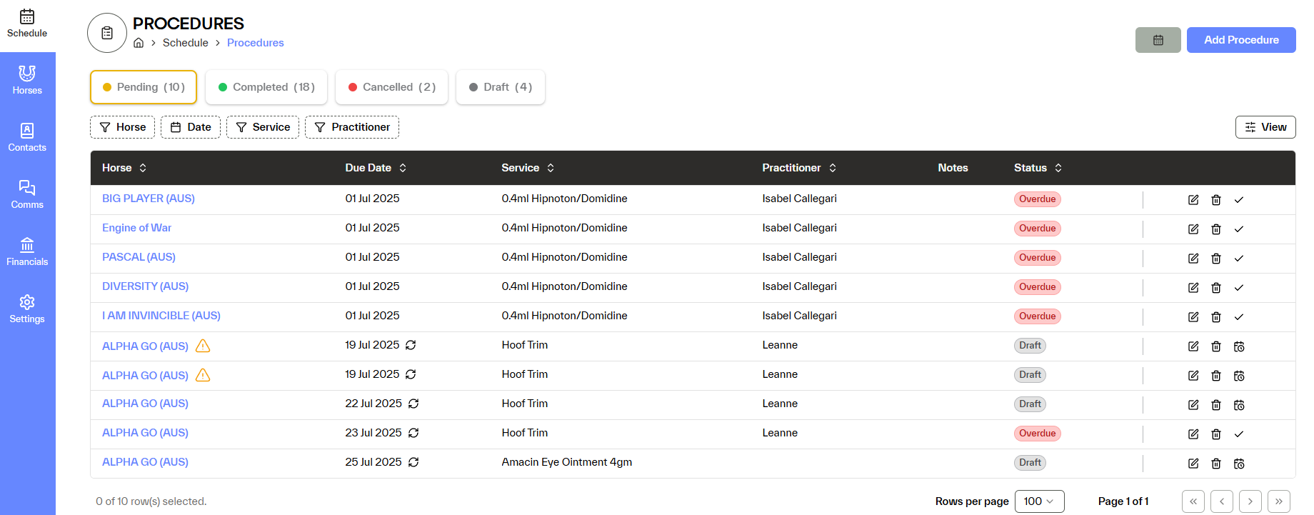 Procedures - quickly review upcoming and past procedures. View procedures in various statuses of Pending, Completed, Scheduled or Draft. View can be filtered by Horse, Date, Procedure or Practitioner.