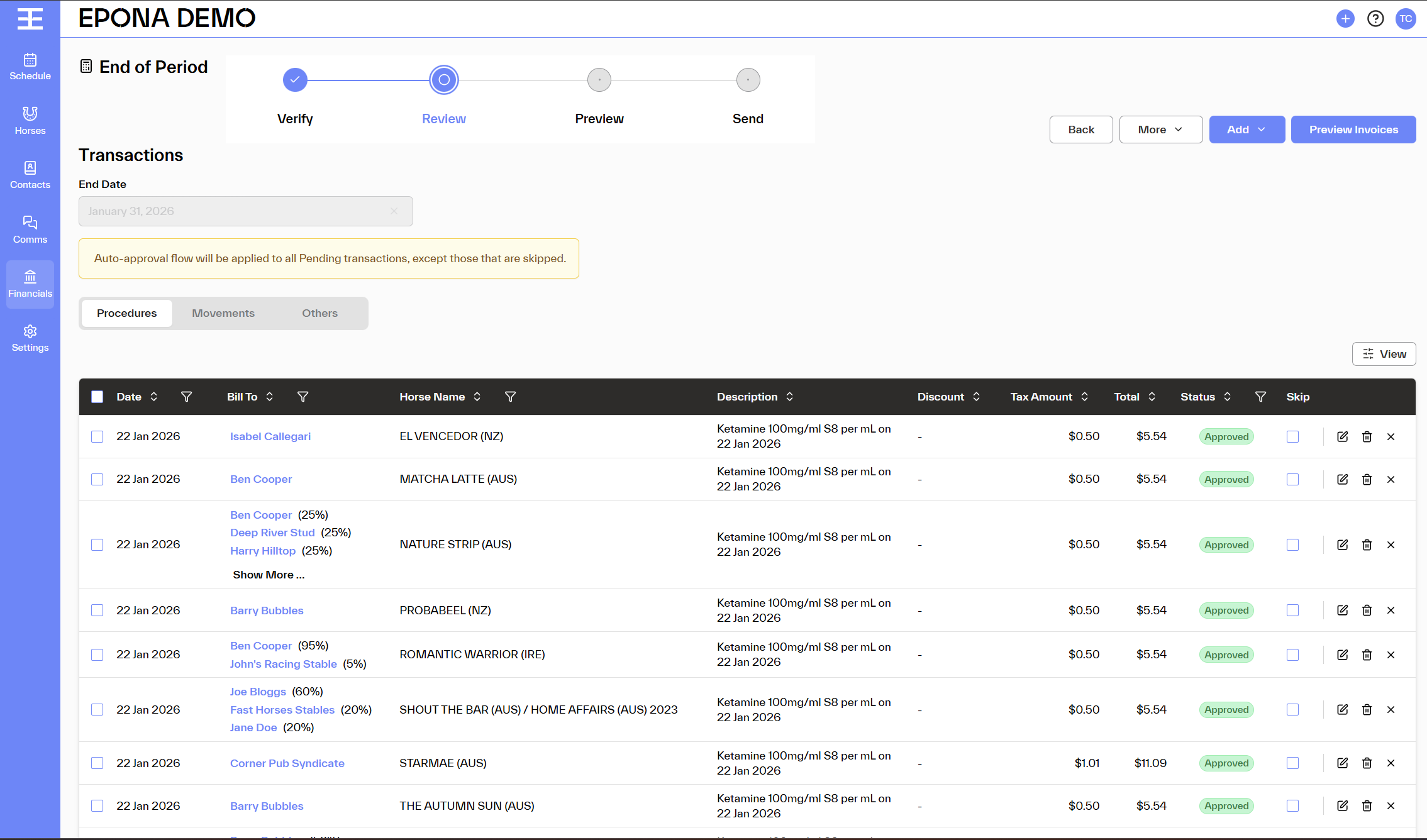 The Review Transactions step allows you to examine all billable activities for the selected period and ensure accuracy before proceeding to invoice generation. After running the Check Validation step and clicking next, you'll see a comprehensive list of all transactions ready for billing. This includes procedures, movements, and other billable activities that occurred during your selected period.
