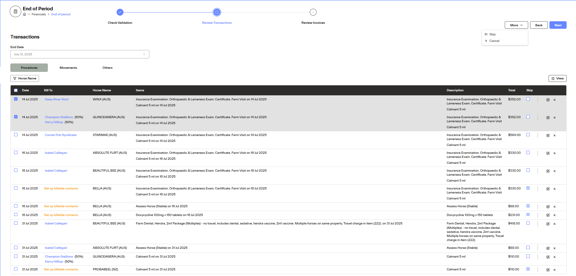 - Skip transactions: Use the checkbox to exclude specific items from invoicing (bulk action available under "More")