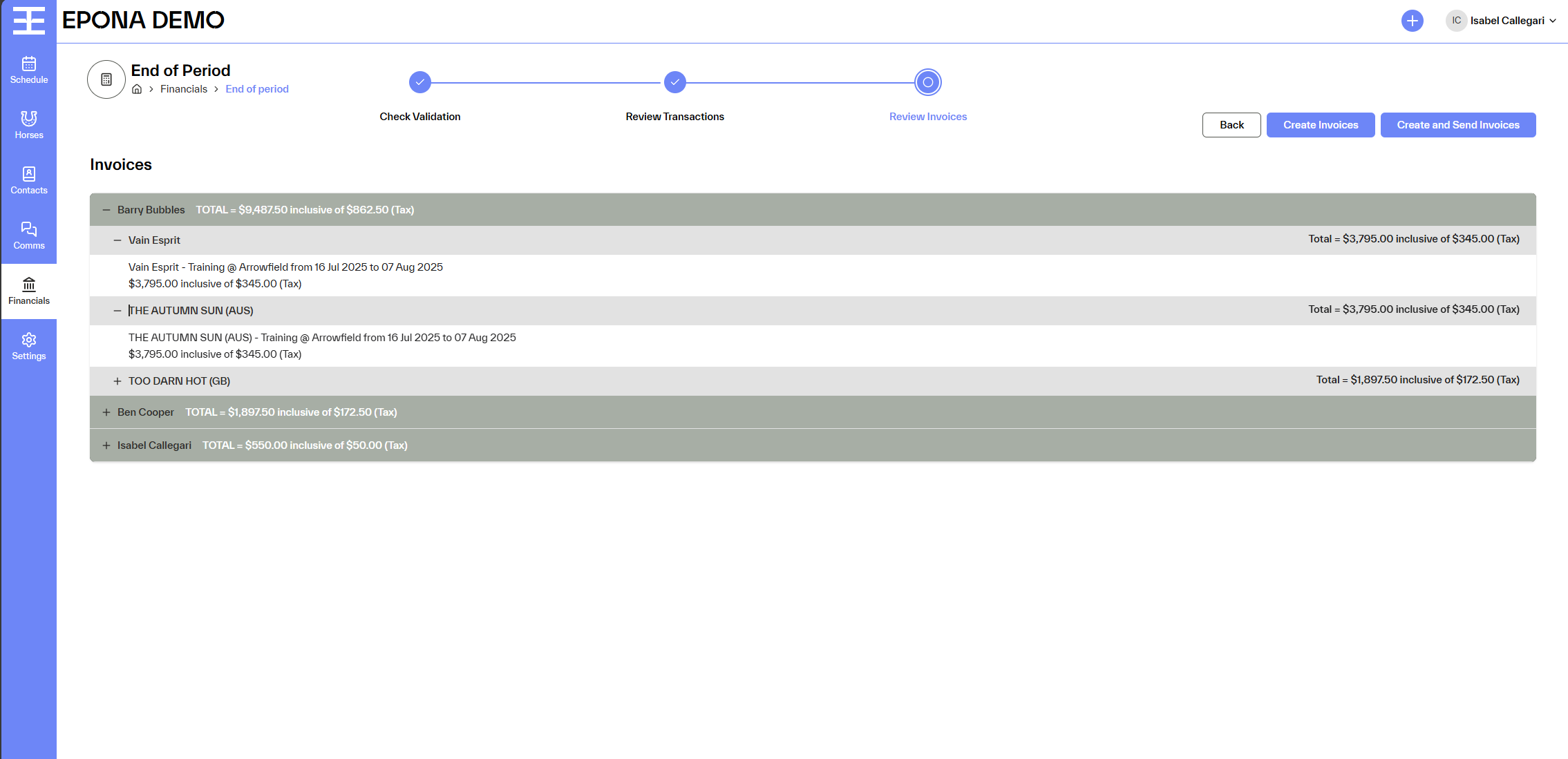Once all invoices are correct, choose whether to Create Invoices in Xero and EPONA or Create and Send Invoices to email them directly to clients. This step completes your End of Period billing process. Statements coming soon!!